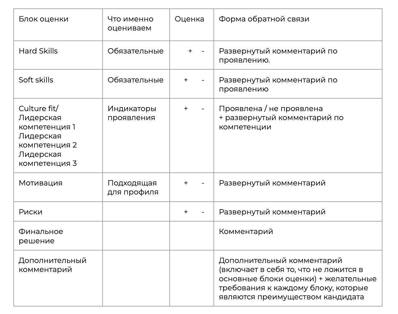 По итогу интервью НМ заполняет структурированный комментарий в Хантфлоу по форме, аналогичной комментарию рекрутера.
